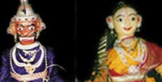 Karnataka, in South India, is a land known for its rich cultural heritage and folk traditions. Karnataka is probably the only State in India where the three major puppet forms - the Marionette, the Rod and the Leather - have been equally popular among the people. These art forms owe their existence to the “Temple based puppet theatre” which flourished for centuries in the State. PUTTHALI KALARANGA is a troupe of experts which has specialized in “Rod Puppetry”. The wooden puppets used by the troupe are one of the tallest of their kind. Each puppet is 3 to 3½ ft. in height and weighs around 8 kgs. The puppets are known for their beauty, traditional embellishments, myriad colours and rich ornamentation. They have made a mark in the Puppet world by their sheen, sparkle and style. The manipulation of the tall and hefty puppets is an arduous task.